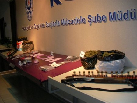 Yakalanan zanlıların ev ve iş yerlerinde yapılan aramalarda piyasa değeri yaklaşık 100 bin lira olan 6 kilo 981 gram kubar esrar maddesi, 2 kilo 135 gram uyuşturucu hap, hassas terazi, ruhsatsız tabanca, şarjör ve 6 adet dolu fişek ve 2 adet tüfek ele geçirildi.