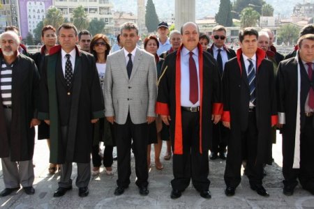 Atatürk anıtında düzenlenen törene Hatay Cumhuriyet Başsavcısı Adem Yazar, Adalet Komisyonu Başkanı Tuğrul Hançerkıran, İdari Mahkeme Başkanı Hidayet Ergenç, Vergi Mahkemesi Başkanı Beyhan Tiryaki, Reyhanlı Cumhuriyet Başsavcısı Hasan Yıldız, Hatay Barosu Başkanı Sinan Akgöl, Mustafa Kemal Üniversitesi (MKÜ) Rektörü Prof.Dr. Salih Hüsnü Güder ve avukatlar katıldı.