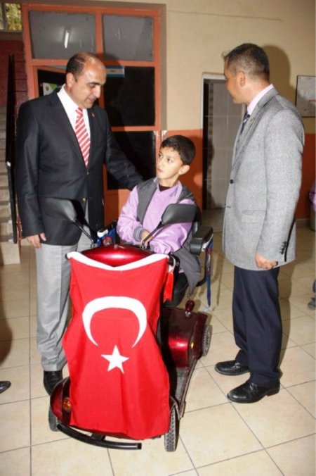 Aksaray Belediye Başkanı Nevzat Palta, zor şartlarda eğitim gören Hacı Cevriye Ünsal İlköğretim Okulu öğrencisi Hamza Ali Akça isimli engelli çocuğa akülü araç hediye etti.