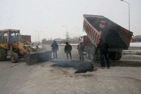 Erzincan Belediyesi soğuk ve yağışlı hava şartlarına rağmen asfalt tamirat çalışması yapıyor. Özellikle şehrin ana arterlerinde ve trafik yükü yoğun bölgelerde devam eden çalışmalarda iki gün içerisinde 150 ton asfalt kullanıldı.