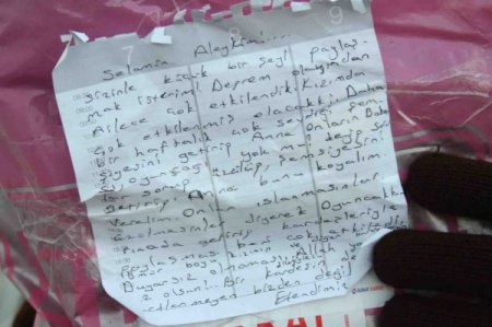 İsmini paylaşmayan annenin yazdığı mektup "sizinle küçük bir şeyi paylaşmak istiyorum" diye başlıyor. Deprem olayından ailece çok etkilendiklerini anlatan anne mektubunda şunları ifade etti: "Kızım da çok etkilenmiş olacak ki daha bir haftalık çok sevdiği şemsiyesini getirip 'Anne onların babası, oyuncağı yok mu?' diyerek sorular sorup üzülüp, şemsiyesini getirip 'Anne bunu koyalım, verelim. Onlar ıslanmasınlar. Üzülmesinler' diyerek oyuncaklarını getirip kardeşleriyle paylaşması beni çok etkiledi. Ömür boyu kızımın ve diğer kardeşlerinin duyarsız olmaması dilekleriyle... Allah yardımcınız olsun. 'Bir kardeşin derdiyle dertlenmeyen bizden değildir' diyen Efendimiz gibi."