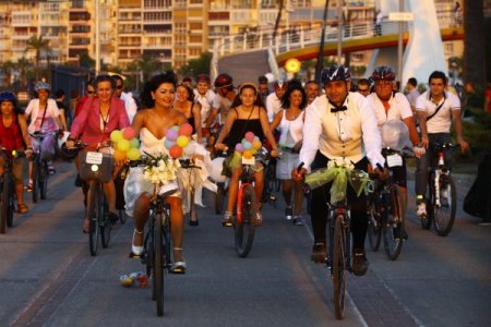 Akın ve Berktaş'ın arkadaşları, dün Göztepe iskelesinde toplanarak çiftin gelmesini beklemeye başladı. Bisikletler, çiçekler ve balonlarla süslendi. İskelede toplanan arkadaşlarının yanına gelen Akın ve Berktaş, "Arabadan in, bisiklete bin" sloganları ve alkışlarla karşılandı.