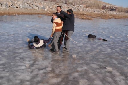 Bitlisin Tatvan ilçesinde bulunan sulama Gölet’inde buz üstüne kayan çocuklardan Halil Yavuz, Hava sıcaklıklarının iyice azalması ile buz tutan derelere yaz aylarında serinlemek için giriyorduk şimdi ise ben ve arkadaşlarım burada oyun oynayarak kayarak vakit geçiriyoruz dedi.