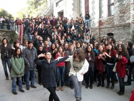 Boğaziçi Üniversitesi öğrencileri, Şeyma Özcan isimli arkadaşlarının gözaltına alınmasını protesto etmek için renkli bir eylem yaptı. Halaylar çeken öğrencilere bazı öğretim üyeleri de destek verdi.