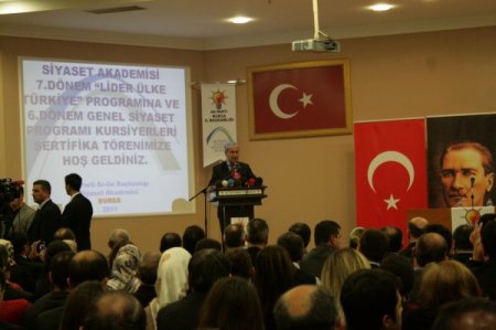 Başbakan Yardımcısı Bülent Arınç, AK Parti Ar-Ge Başkanlığı tarafından yürütülen Siyaset Akademisi'nin Bursa'daki 7. dönemdeki 'Lider ülke Türkiye' programı ve sona eren 6. dönem genel siyaset programı kursiyerlerinin sertifika törenine katıldı.