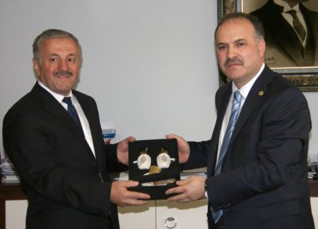 Trabzon Belediyesi'nin çalışmaları hakkında bilgi veren Başkan Vekili Kınalı, ziyaret anısına Gedikli'ye gümüş telkarili kahve fincanı hediye etti.