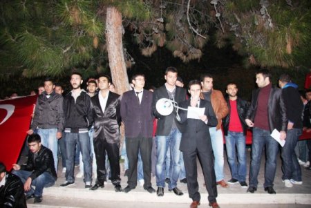 Türk Bayrakları ile Cumhuriyet caddesinden yürüyerek Cumhuriyet meydanında toplanan yaklaşık 200 kişilik grup; 'Kahrolsun PKK', 'Askere uzanan eller kırılsın', İmralı basılsın Apo asılsın' şeklinde sloganlar attı.