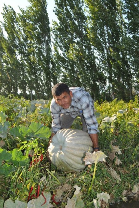 Karataş’ın yetiştirdiği 50 kilogramlık bal kabağını duyanlar kabağı yakından görmek üzere tarlaya gidiyor.