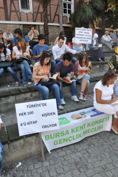Her 100 kişiden sadece 4\'ünün kitap okuduğu Türkiye\'de, Bursalı gençler tarafından anlamlı bir kampanya başlatıldı. Bursa Kent Konseyi Gençlik Meclisi, halkın kitap okuma alışkanlığını artırmak amacıyla \'Kitap Okuma Kampanyası düzenledi. Her kesimden insanın destek verdiği etkinlikte, vatandaşlar 2 saat boyunca kitap okudu. Bursa Kent Konseyi Gençlik Meclisi\'nin organizasyonuyla gerçekleştirilen kitap okuma kampanyası, Heykel’deki Tarihi Belediye binasının arkasında bulunan amfide gerçekleştirildi.