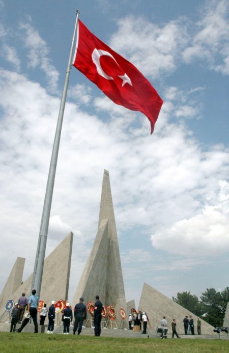 Tuğgeneral Fındıkoğlu, burada yaptığı konuşmada, Büyük Önder Mustafa Kemal Atatürk'ün, Başkomutan olarak 31 Ağustos 1922'de muharebe sahasını gezerken Berberçam Tepesi civarında düşman topçu mermisinin açtığı çukura gömülü bir sancaktar Mehmetçik gördüğünü söyledi. Aziz şehidin, toprağın üzerinde katılaşmış koluyla sancağı dimdik tutmasından etkilenen Atatürk'ün, savaştan sonra bölgede yapılacak anıt için bunun sembol alınmasını istediğini belirten Tuğgeneral Fındıkoğlu, şöyle devam etti: "Gazi Mustafa Kemal Paşa, verdiği direktifin takipçisi olarak bu kez Cumhurbaşkanı sıfatıyla 1924 yılında, Büyük Zafer'in ikinci yıl dönümünde kalabalık bir heyetle Şehit Sancaktar Mehmetçik Anıtı'nın temel atma törenine katılır. Bu törende, yeni Türk devletinin çeşitli kurumlarını temsil eden takdimciler tarafından konuşmalar yapılmıştır."