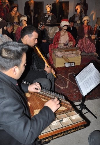O dönemi canlandıran mankenlerin arasına oturan Davutoğlu ve beraberindekiler musiki dinledi.