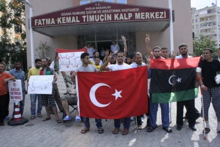 Adana Numune Eğitim ve Araştırma Hastanesi Fatma Kemal Timuçin Kalp Merkezi'nde tedavileri süren 64 Libyalı, geldikleri günden beri Libya Büyükelçiliği'nin kedileriyle ilgilenmediğini ifade ederek, hastana önünde toplandı. Kimisi koltuk değnekleriyle kimisi tekerlekli sandalyelerle eylem yapan yaralı Libyalılar, Türk ve Libya bayrakları açarak Libya büyükelçisinin kendilerini ziyaret etmesini istedi. Yaralı Libyalılar adına açıklama yapan Ahmed Smaio, Türkiye hükümetinin ve hastane personelinin gösterdiği ilgiden çok memnun olduklarını, ancak kendi büyükelçilerinin ilgisizliğine daha fazla dayanamadıklarını söyledi.
