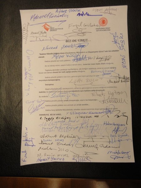 İmzaya açılan bildirgenin içeriği ise şöyle: “Kadına Yönelik Şiddete Karşı Mücadele ve Dayanışma Günü'nde biz erkekler olarak kadına yönelik her türlü şiddetin acı ve ızdırap veren, yaşam hakkını tehdit eden, temel bir insan hakkı ihlali olduğuna, toplumu derinden yaralayıp zayıflattığına, aile birliğini zedeleyip anne ve çocuk sağlığını bozan son derece önemli bir halk sağlığı sorunu olduğuna, kadına yönelik şiddetin katı töre, gelenek gibi hiçbir gerekçeyle asla meşrulaştırılamayacağına inanıyoruz. Hayat arkadaşlarımız, kardeşlerimiz, annemiz, geleceğimizi emanet ettiğimiz evlatlarımız, kadınlar bu toplumun yarısını oluşturan erkeklerle aynı haklara sahip bireylerdir. Bu nedenle kadına yönelik şiddete ortak olmayacağız, seyirci kalmayacağız. Kadına yönelik şiddete son vermek için el ele verelim. Kadına karşı şiddetle mücadelede erkekler olarak üzerimize düşen görevi yapmak üzere kararlıyız, biz de varız.” CİHAN
