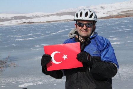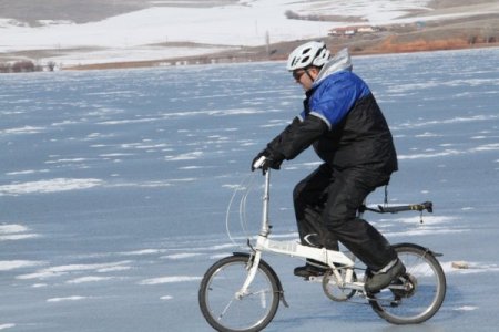 Kırşehir Bisiklet ve Doğa Sporları Derneği (BİDOS) Başkanı Serkan Altuk, yaklaşık 15 santimetre buz tutan göl üzerinde bisiklet sürdü. Çılgın bisikletçi, zaman zaman dengesini kaybederek yere düştü. Gölün kenarında bulunan çocuklar ise buzun kırılmaması için dua etti.