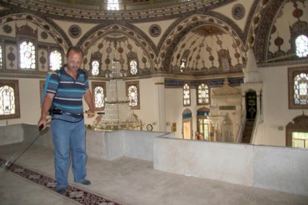 2 kişi tarafından tulumbalar yardımıyla tüm camilerin iç mekanlarına gülsuyu sıkıldı.