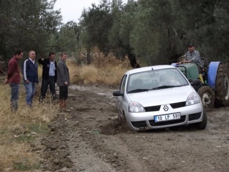 Balıkesir Edremit'te yağan yağmurla birlikte bazı araçlar çamura saplandı. Çamura saplanan otomobil traktör yardımıyla güçlükle çıkarıldı.