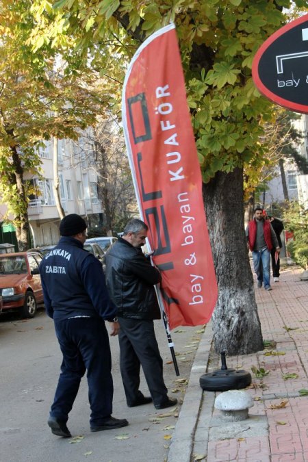 Ankara'nın Çankaya ilçesinde zabıta ekipleri, iş yerlerinin önünde bulunan flama biçimindeki ayaklı kırlangıç tabelalara el koydu.