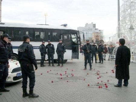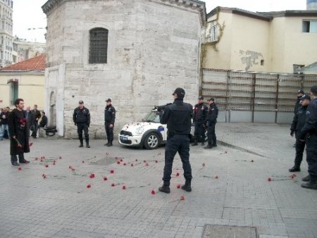 Taksim Meydanı’nda canlı bomba eylemcisi! polise bu kez gül attı. İstanbul Terörle Mücadele Şube Müdürlüğü tarafından televizyonlarda gösterilmek üzere hazırlanan tanıtım filmleri kapsamında Taksim’deki üzücü olay yeniden sahnelendi. Bu kez eylemci polise bomba yerine gül attı. Vatandaşların yoğun ilgi gösterdiği çekimlerin devam edeceği öğrenildi. İstanbul polisi, vatandaşları bilinçlendirmek, polisle olan diyalogları arttırmak amacıyla hafızalarda yer edinen olayları farklı açılardan işleyerek tanıtım filmi çekiyor. Taksim Meydanı’nda 31 Ekim 2010 tarihinde yaşanan ve çok sayıda polis ile vatandaşın yaralandığı canlı bomba eylemi filme alındı. Film için polis bu kez olayın yaşandığı Taksim Meydanı’nda sinemacıların rahat çekim yapabilmesi için güvenlik önlemi aldı. Olay anında yaralanan çevik kuvvet ve Beyoğlu polis ekipleri yine aynı yerde hazır bulundu. Eylemci bu kez belinde bomba yerine karanfillerle polise yaklaştı. Otomatik silahını canlı bomba elemcisine yönelten çevik kuvvet polisi, o anları yeniden yaşadı. Otuzun üzerinde polis ve vatandaşın yaralandığı yere bu kez eylemci karanfiller attı. Film için defalarca aynı sahne çekildi. Vatandaşlar çekimleri ilgiyle izledi. Çekimlerin Terörle Mücadele Şube Müdürlüğü tarafından yaptırıldığı ve devam edeceği öğrenildi. CİHAN