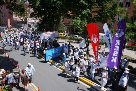 Bir günlük iş bırakma eylemi kapsamında Fatih'teki Çapa Tramvay Durağı'nda toplanan memurlar, protesto gösterilerinin yapılacağı Beyazıt Meydanı'na yürümeye başladı.