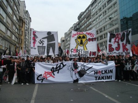Şişli’de toplanan Çarşı grubu, ‘Çarşı faşizme karşı’ şeklinde slogan atarak yürüyüşe geçti. Arama noktalarından geçen Çarşı üyeleri, kutlamalar için Taksim meydanına girdi.