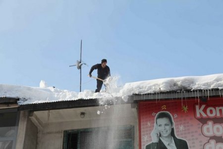 Ağrı il ve ilçelerinde yaklaşık 3 gün boyunca etkisini sürdüren yoğun kar yağışı yerini dondurucu soğuklara bırakırken karla mücadele çalışmaları aralıksız sürüyor. Yağışın etkisini kaybetmesiyle çarşı merkezinde bulunan binaların çatılarında biriken karlar da temizlenmeye başlandı. Biriken karların iş yerlerine gelen müşterilerin üzerine düşmesinden korkan esnaf, sabah saatlerinden itibaren çatılara çıkarak küreklerle karları temizlemeye çalıştı. Dükkân sahipleri, kayarak düşme tehlikesine karşı da bellerine ip bağladı. CİHAN