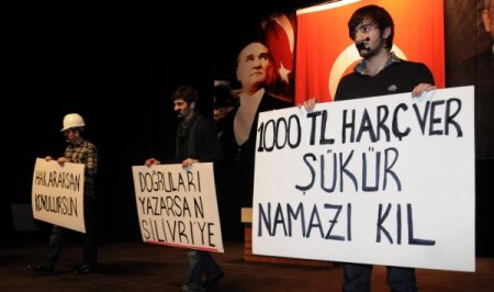 Bu arada, konferansın başında CHP’li gençler hükümetin politikalarını eleştiren kısa bir tiyatral gösteri yaptı. Gençlerin, ağızları bantlı ve ellerinde üzerinde değişik yazıların yer aldığı afişlerle yaptıkları gösterilerinde üniversitelerdeki harçlarını eleştirmek için kullandıkları afişteki “1000 TL Harç Ver Şükür Namazı Kıl” yazısı dikkat çekti. Gençlerin taşıdığı diğer afişlerde ise “Öğretmen Değil Molla Gerek, Hak Ararsan Kovulursun, Doğruları Yazarsan Silivri’ye” yazıları yer aldı. CİHAN