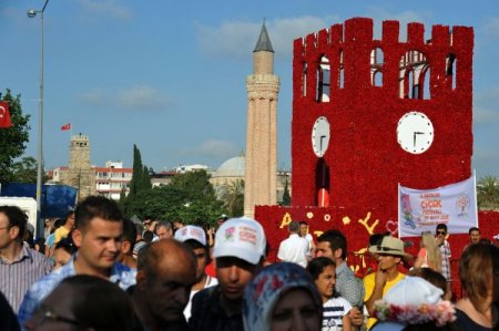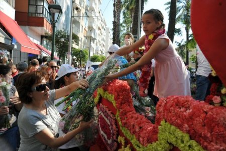Antalya’da, bu yıl 8.'si yapılan Çiçek Festivali kapsamında düzenlenen kortejde 100 bin dal çiçek dağıtıldı. Festival kapsamında, 1 milyon dal çiçekten saat kulesi yapıldı.