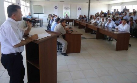 Mardin’in Kızıltepe ilçesinde hasat mevsimi nedeniyle zahireci esnaflarla bilgilendirme toplantısı yapıldı. Hububat merkezi Müzayede Salonu'nda yapılan toplantıya Kızıltepe Ticaret Borsa Başkanı Mehmet Şahin, Zahireciler Derneği Başkanı Mehmet Şerif Öter, zahireci esnafı ve çiftçiler katıldı. Ticaret Borsası Başkanı Şahin ve Dernek Başkanı Öter, çiftçileri sahte faturaya karşı uyardı.