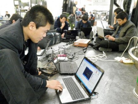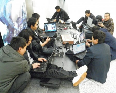 Uçak beklerken genellikle banklarda oturmayı tercih eden yolcuların aksine 9 Çinli, gecikmeyi fırsat bilip laptoplarına sarıldı.