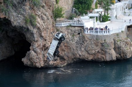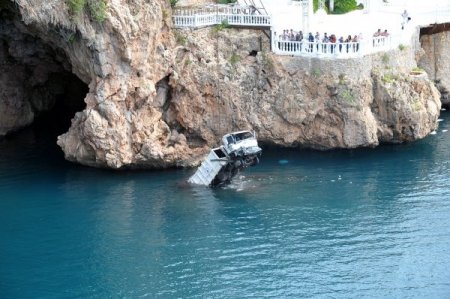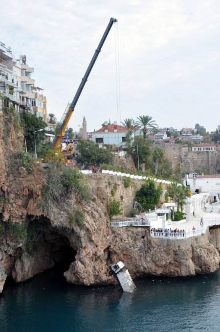 Antalya Yat Limanı’nda bulunan konteynırlardaki çöpleri toplamaya çalışan çöp kamyonu freninin boşalması nedeniyle yaklaşık 30 metre yükseklikteki falezlerden deniz uçtu. Kamyon dev vinç yardımıyla denizden çıkarıldı. CİHAN