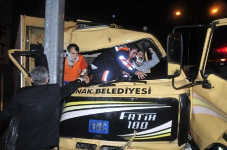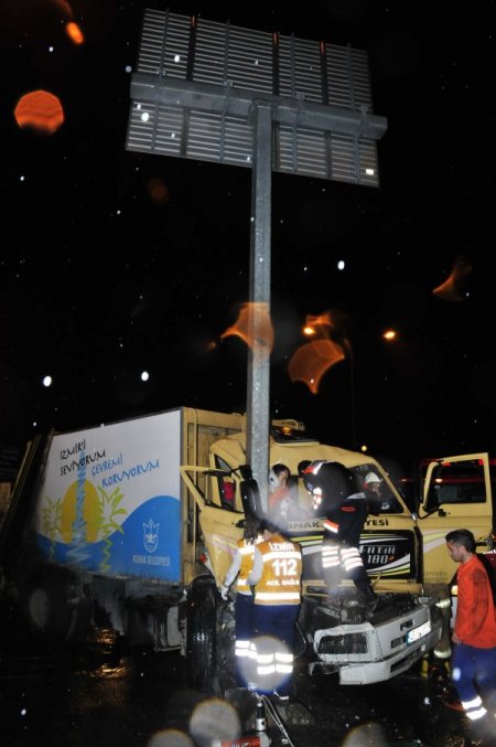İzmir'de, Konak Belediyesi'ne ait çöp toplama kamyonu Gediz Kavşağı'ndaki yön levhasına çarptı. Kazada kamyon sürücüsü ile yanında bulunan görevli araç içinde sıkıştı. Sürücü kısa sürede araçtan çıkarıldı. Ekipler, yanındaki görevliyi çıkarmak için yaklaşık bir saat uğraş verdi.