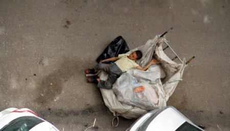 Yer, Diyarbakır’ın Yenişehir ilçesi. Tan vakti çöp toplamaya çıkan bir çocuk, belli ki kaldıramamış uykusuzluğu. Cadde bomboş ne de olsa. Çekmiş çöp arabasını park eden araçların arkasına, vurmuş kafayı yatıyor. Gelip geçen araçlar umurunda değil. Kim bilir rüyasında neler görüyor. O belki de onun en keyifli anı.