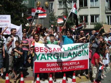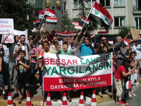 Türkiye’de yaşayan bir grup Suriyeli, Teşvikiye Camii’nde Cuma Namazı kıldıktan sonra protesto amacıyla Suriye’nin İstanbul Başkonsolosluğu önünde toplandı. Suriye bayrakları taşıyan ve ‘Beşşar Lahey’de yargılansın’ yazılı pankart açan grup, üzerinde ‘Beşşar gidecek özgürlük gelecek’ , ‘Suriye’de yaşanan katliamlar karşısında sessiz kalınmasını tarih asla unutmayacaktır’ yazılı dövizler açtı.