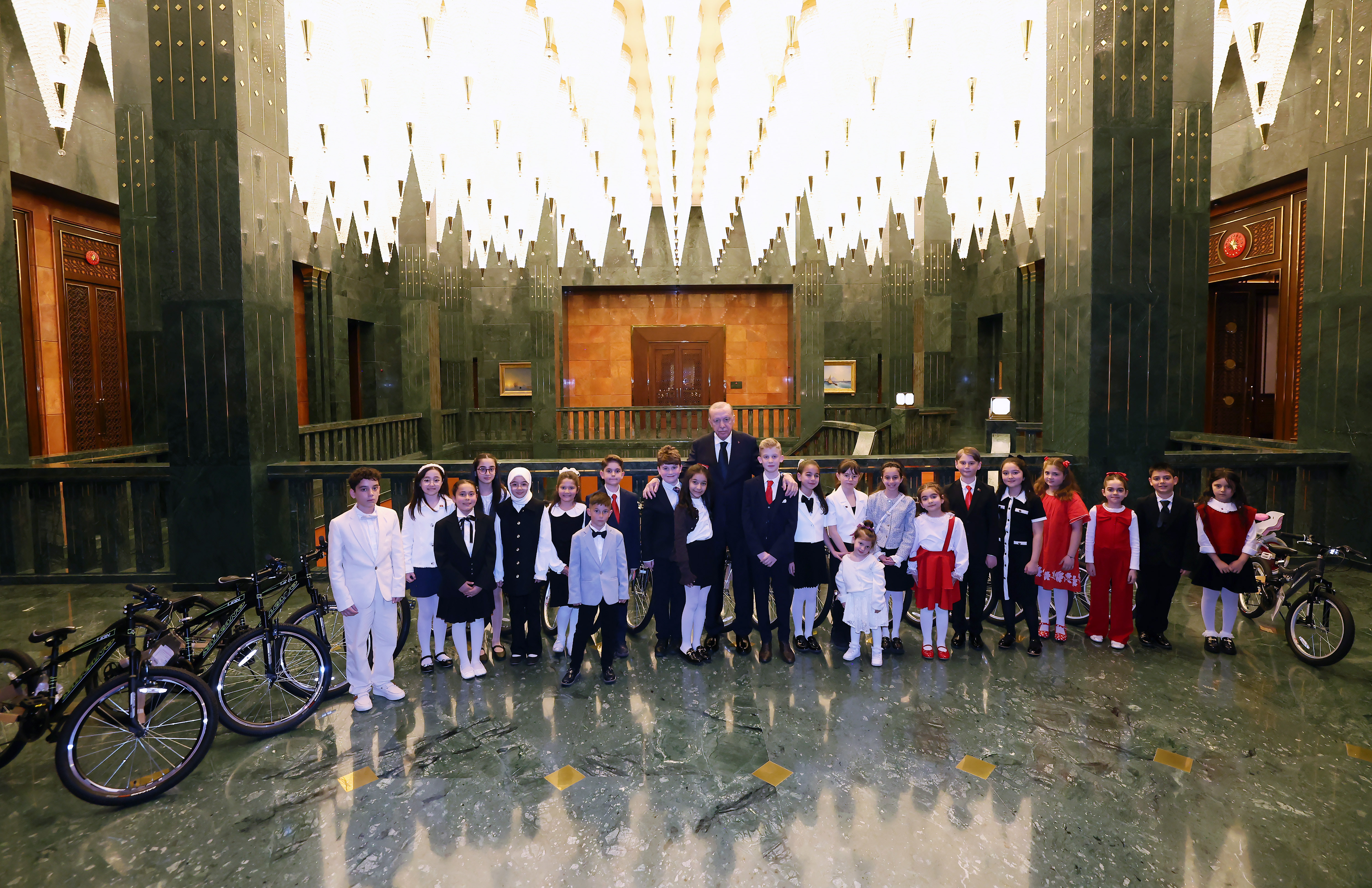 Cumhurbaşkanı Recep Tayyip Erdoğan, 23 Nisan Ulusal Egemenlik ve Çocuk Bayramı ile TBMM'nin 106. açılış yıl dönümü dolayısıyla Cumhurbaşkanlığı Külliyesi'nde Milli Eğitim Bakanı Yusuf Tekin ve beraberindeki çocukları kabul etti.