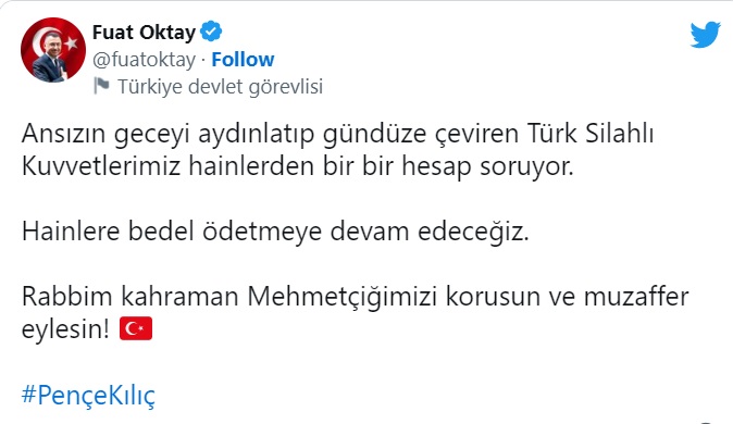 FUAT Oktay, sosyal medya hesabından paylaştığı mesajında, "Ansızın geceyi aydınlatıp gündüze çeviren Türk Silahlı Kuvvetlerimiz hainlerden bir bir hesap soruyor. Hainlere bedel ödetmeye devam edeceğiz. Rabb'im kahraman Mehmetçiğimizi korusun ve muzaffer eylesin." ifadesini kullandı.