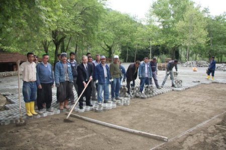 Kozan Feke Karayolu üzerindeki Dağılcak mesire alanında çevre düzenleme çalışmaları gerçekleşirken park alanı da parke kilit taşı ile döşeniyor.