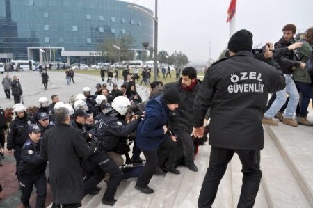 Dışişleri Bakanı Ahmet Davutoğlu'nun gelişi sırasında eylem yapmak isteyen gruba, önce özel güvenlik, ardından polis müdahale etti.