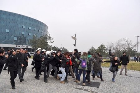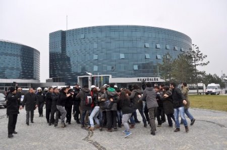 Slogan atan öğrencilere, önce üniversitenin özel güvenliği müdahale etti. Ardından, devreye giren çevik kuvvet polisi grubu alandan uzaklaştırdı. Bu sırada grup üyeleri ile güvenlik görevlileri arasında arbede yaşandı. CİHAN