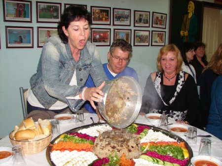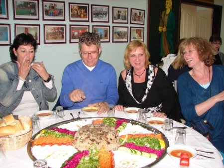 Bir hafta kalacak olan heyet, DEGDER’i de ziyaret etti. Dernek yetkilileri, misafirlerine öğle yemeğinde maklube ikram etti. Heyet üyeleri, ilk defa gördükleri, bir siniye tencereyle ters çevrilip kalıp şeklinde çıkarılan etli pilav ve etrafına süsleme olarak salata ve yoğurt koyulan yemeği beğenerek yedi.
