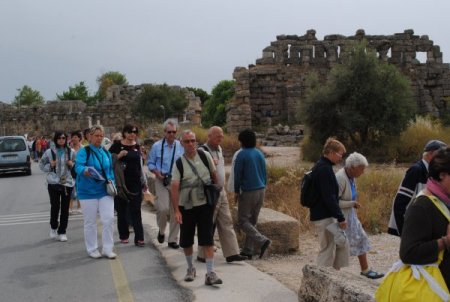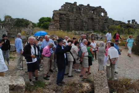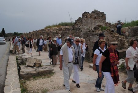 Deniz yoluyla Antalya'ya gelen 500 Fransız turist Side Antik Kent'te arkeoloji turuna çıktı. Bir gün Antalya'da kalacak olan Fransız turistler, 18 gün süresince Akdeniz ülkelerini gezecek. Türkiye'den sonra Kıbrıs'a ardından Yunanistan, Malta, Marsilya, İtalya, İspanya, Portekiz' e gidecek olan Fransızlar 18 gün içinde 8 ülke gezmeyi hedefliyor. Taaj Turizm Seyahat Acentesi Arkeoloji Turizmi Uzmanı Mustafa Akdağ, deniz yoluyla Antalya'ya gelen 500 turisti 6 turist rehberi eşliğinde Side Antik Kent'e arkeoloji turizmine çıkardıklarını söyledi. Fransızları Side'nin yanı sıra Selge, Seleukia, Aspendos, Olimpos, Termessos ve Perge Antik Kent'ini de gezdireceklerini belirten Akdağ, yabancı konukların ilk defa geldikleri Türkiye'de Side'ye hayran kaldığını kaydetti. Akdağ, "Fransızlar Side'yi çok beğendi. Bir gün içinde 500 Fransız konuğa ülkemizin tarihi ve doğal güzelliklerini anlatmanın sevinci yaşadık. Fransızlar Türk insanını çok sıcak kanlı ve sempatik buluyor. Antalya bölgesinin arkeolojik zenginliğini görünce çok şaşırdılar." diye konuştu.