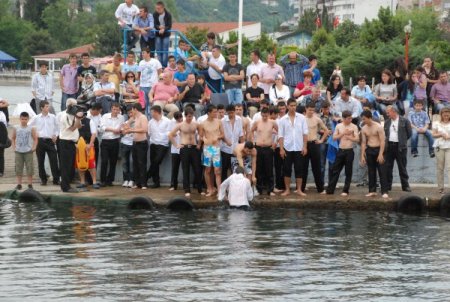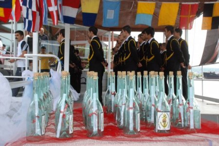 Kdz. Ereğli Hatice Erdem Anadolu Denizcilik Meslek Lisesi'nden mezun olan 45 öğrenci için Polisevi çay bahçesinde ilginç bir tören düzenlendi. Öğrenciler, şişe içinde denize atılan diplomalarını okul formalarıyla suya girerek aldı. Belgelerini alan 45 öğrenci, mezuniyetlerini hep birlikte suya atlayıp denizde Türk bayrağı açarak kutladı.