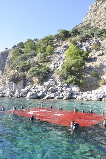 Toplam 30 kişinin katıldığı etkinlikten önce Marmaris Limanı'ndan açılan Paradise Diving teknesiyle Akdeniz ile Ege’nin kesiştiği noktaya hareket edildi. Araların da hanımların da bulunduğu ekip, öğle saatlerinde Cennet Adası Akvaryum Koyu mevkisinde daldı. Yaklaşık 45 dakika deniz altında kalan ekipteki eğitmen Egemen Özer, çıkışta yaptığı açıklamada, “Öncelikle geçen günlerde vermiş olduğumuz şehitlerimize Allah'tan rahmet, ailelerine başsağlığı diliyorum. Mustafa Kemal Atatürk’ün ve yüce Türk milletinin büyük fedakârlıklarla kurduğu cumhuriyetimizin 88. yıldönümünü, su altında büyük bir coşkuyla kutladık. Ülkemizin geçirdiği bu zor zamanlarda birlik ve bütünlüğümüzü bozmak isteyenlere karşı kenetlenmemiz gerektiği bir dönemdeyiz. Bölünmez bütünlüğümüze örnek olabilmek maksadıyla bayrağımızı suyun altıda dalgalandırdık. Bize destek veren Muğla Üniversitesi BESYO Rekreasyon Bölümü'ne teşekkür ederiz.” dedi.