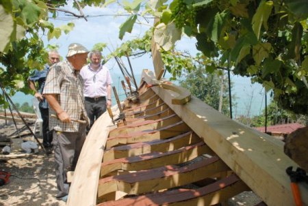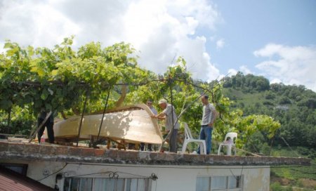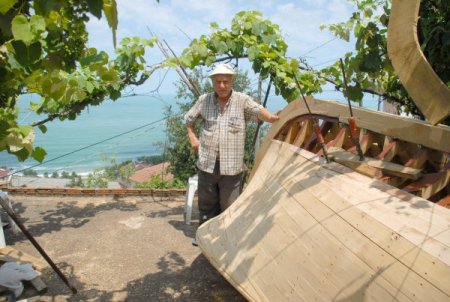 Rizeli marangoz ustası Mustafa Yenigün (60), kayığını denizden 500 metre uzaktaki evinin çatısında yapıyor.