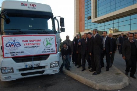 Gaziantep Halı İhracatçıları Birliği ve Halıcılar Odası’nın işbirliği ile Van’daki depremzedelere yardım için düzenlenen kampanyada toplam 600 bin lira tutarında 45 bin metre halı toplandı. Halılar, 4 TIR ve 3 kamyona yüklenerek, Van’a doğru yola çıktı.