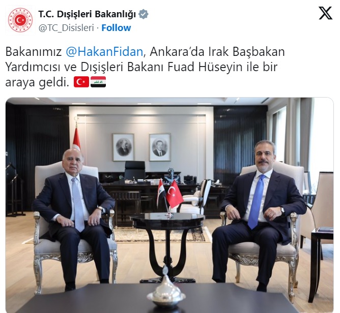 Dışişleri Bakanlığı'nın X hesabından yapılan paylaşımda, "Bakanımız Hakan Fidan, Ankara'da Irak Başbakan Yardımcısı ve Dışişleri Bakanı Fuad Hüseyin ile bir araya geldi" ifadesine yer verildi.