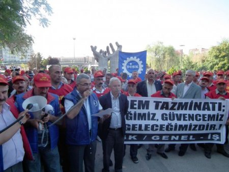 "Kıdem tazminatı emeğimiz, güvencemiz, geleceğimiz" yazılı dövizler taşıyan işçiler ise sık sık "Kurtuluş yok tek başına, ya hepimiz, ya hiç birimiz" şeklinde slogan attı.