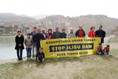 Doğa Derneği üyeleri, Ilusu Barajı gölü altında kalma tehlikesi yaşayan Hasankeyf'te Dicle Nehri kıyısında, 14 Mart Dünya Nehirler Günü nedeniyle, 'Söz sırası Hasankeyfliler'de' sloganıyla eylem yaptı.