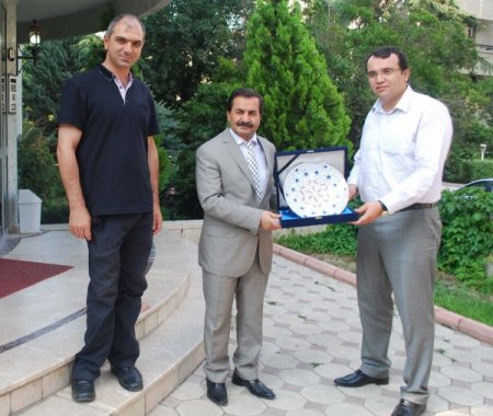 Prof. Dr. Ahmet Karaaslan, ziyaretin anısına TÜTEV Genel Sekreteri Vural Gökkoyun'a bir hediye takdim etti.