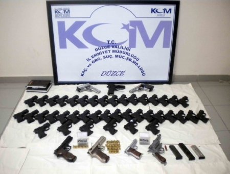 Düzce Emniyet Müdürlüğü'nden yapılan açıklamada, Düzce İl Emniyet Müdürlüğü Kaçakçılık ve Organize Suçlarla Mücadele Şube Müdürlüğü'nce, planlı olarak yürütülen 'Teşekkül Halinde Ateşli Silah Ticareti Yapmak' suçu ile ilgili olarak; 29.07.2011 günü A.C. ve T.Ö. isimli şahısların Ankara ilinde Y.C. isimli şahıs ile bağlantılı olarak temin etmiş oldukları çok sayıda silahları Balıkesir iline götüreceklerinin tespit edilmesi üzerine, Ankara iline giden KOM Şube Müdürlüğü Ekipleri, Polatlı ilçesinde durdurdukları, sürücülüğünü A.C.’nin yapmış olduğu ve yanında T.Ö.'nün de bulunduğu araçta yapmış oldukları aramada, 40 adedi Glock olmak üzere, toplam 47 adet tabancaya el koydu. A.C. ve T. Ö. isimli şahıslar ise yakalanarak gözaltına alındı.