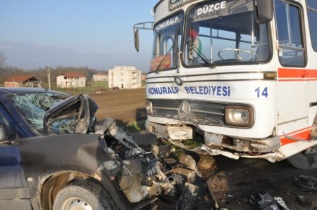 Düzce'de sabah saatlerinde meydana gelen kazada, biri ağır olmak üzere 2 kişi yaralandı.Düzce Yeni Kent Kanal Yolu üzerinde meydana gelen kazada; Yığılca istikametinden Yeni Kent istikametine gitmekte olan Konuralp Belediyesi'ne ait 81 AE 595 plakalı yolcu otobüsüne, karşı istikametten gelen İrfan Çaklı (57) idaresindeki otomobil çarptı.Kaza ardından, otomobil sürücüsü İrfan Çalkı, vatandaşlar tarafından araç içinden çıkarılırken, yolcu olarak bulunan 37 yaşındaki Miraç Namlıtürk Düzce Belediyesi İtfaiyesi'ne ait kaza kırım ve kurtarma ekibi tarafından çıkarıldı. Yaralılar, 112 Acil Servis ambulansı ile Düzce Atatürk Devlet Hastanesi ve Düzce Üniversitesi Hastanesi'ne götürülerek tedavi altına alındı. Yaralılardan Miraç Namlıtürk’ün ağır yaralı olduğu ve hayati tehlikesinin bulunduğu belirtilirken, oto sürücüsü İrfan Çaklı’nın ise ayaklarında kırık olduğu öğrenildi. Polis, kaza ile ilgili soruşturma başlattı.
